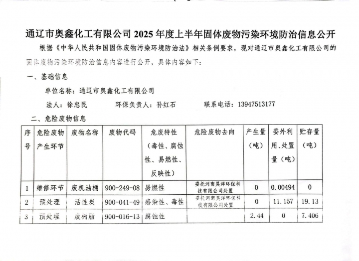 通遼市奧鑫化工有限公司2025年度上半年固體廢物污染環(huán)境防治信息公開