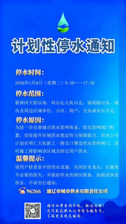霍林河大街以南、科爾沁大街以北,福利路以東,域內(nèi)及周邊區(qū)域單位、小區(qū)、商戶,無(wú)水或水壓不足,