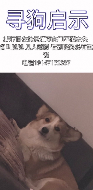 小狗丟失于怡景將南 3月七日上午11點(diǎn)在小區(qū)門口走丟 如果遇見此小狗 請(qǐng)立即與我聯(lián)系 必有重謝!