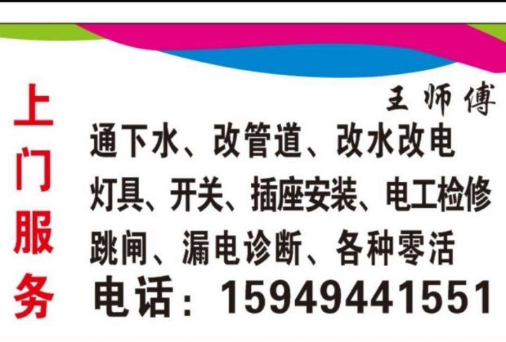 專(zhuān)業(yè)疏通下水道、通坐便器,洗菜盆。地漏等,改管道,改上下水,換各種水件閥門(mén),維修馬桶等,安裝浴室柜,修水龍頭、改水改電,燈具安裝、跳閘、漏電診斷,開(kāi)關(guān)插座安裝,掛畫(huà),穿網(wǎng)線,維修各種小零活等.........